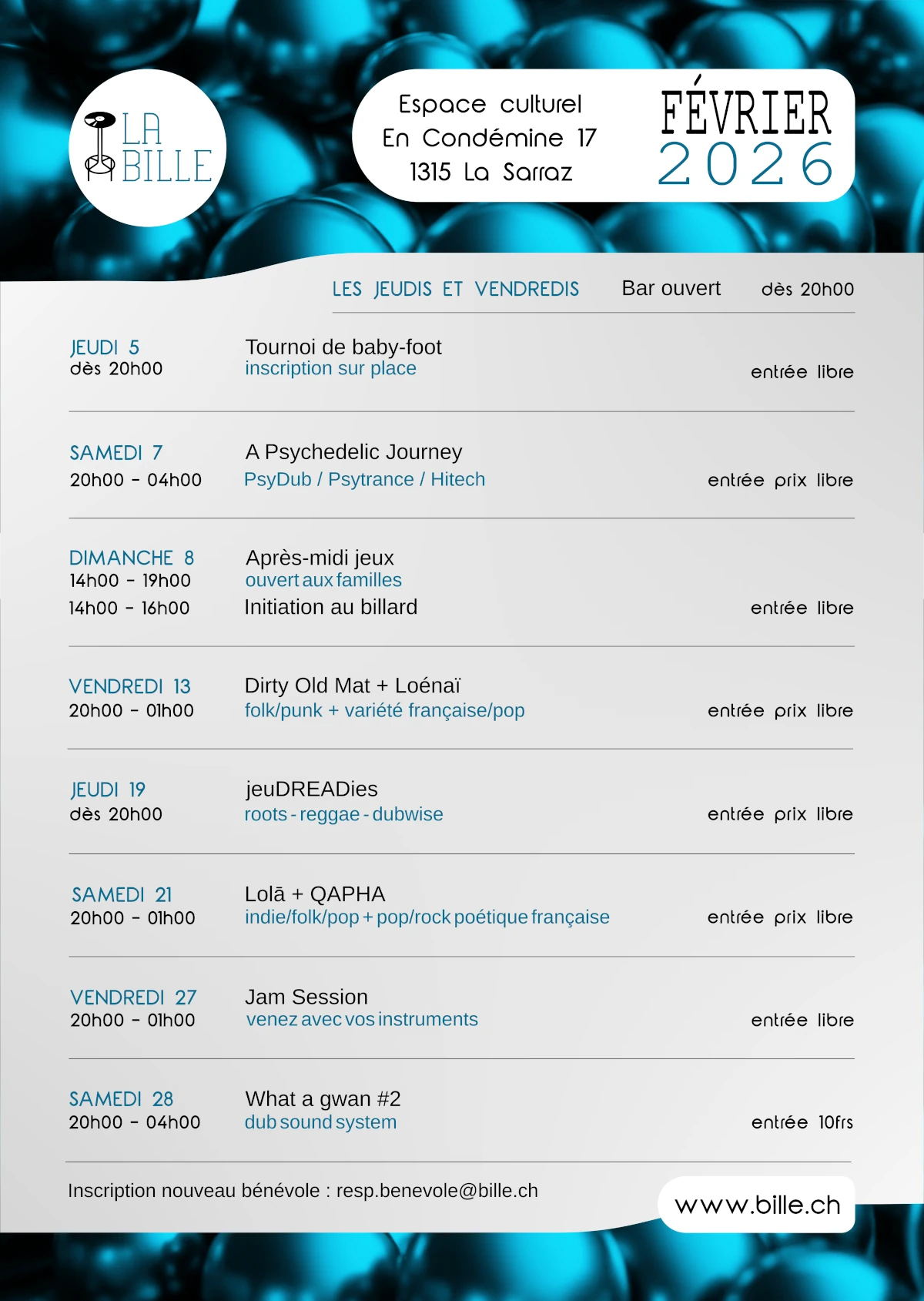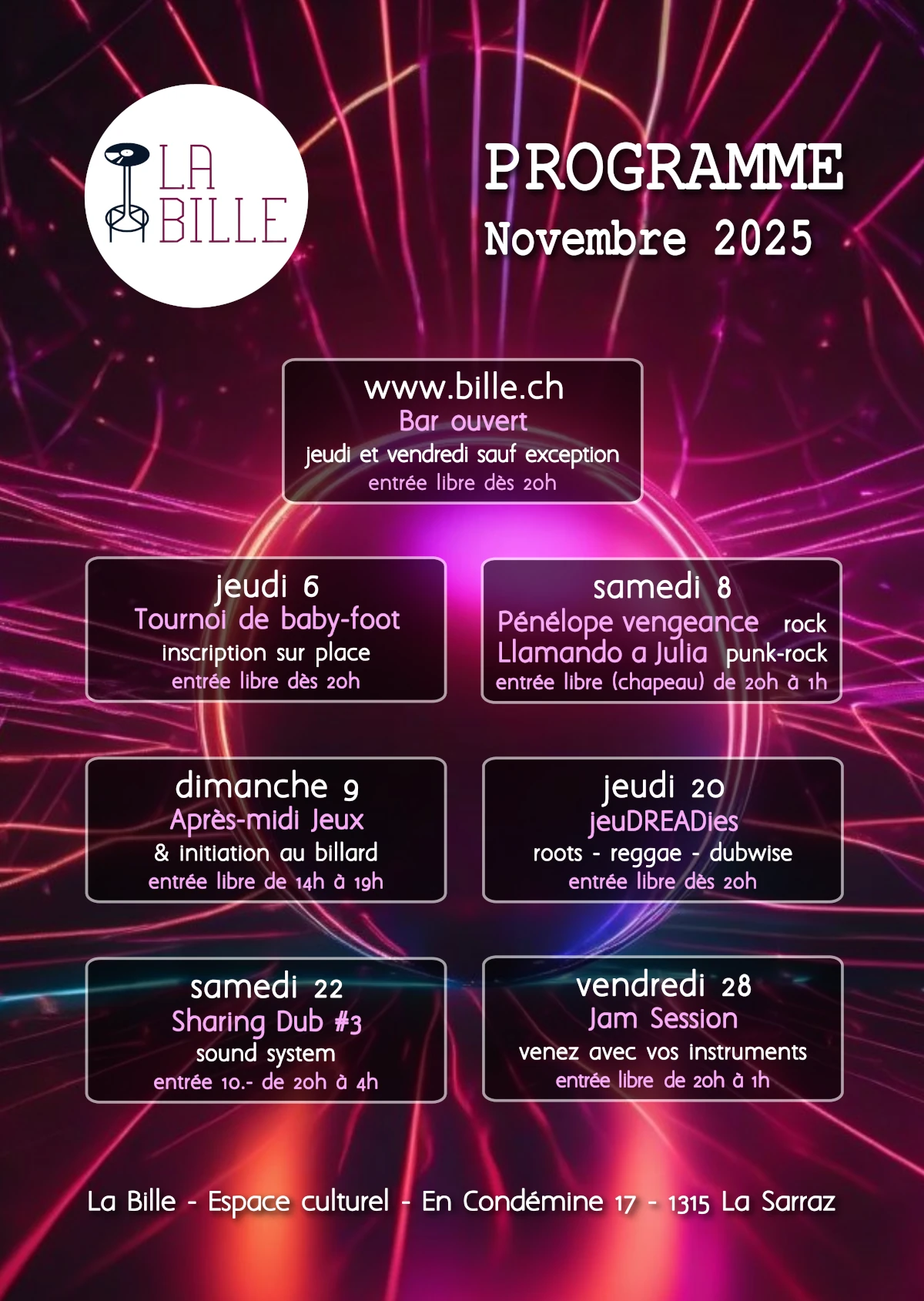 La Bille est un espace culturel situé dans la zone artisanale de La Filature au bord de la Venoge à La Sarraz. Nous vous proposons divers événements, concerts, dj’s, animations, performances artistiques, expositions et jeux. Le tout dans un cadre atypique doté d’un bar, d’une salle événementielle, d’un espace détente et d’un coin billard, baby-foot et flipper. C’est un lieu multiculturel propice aux échanges humains et aux découvertes de toutes sortes.