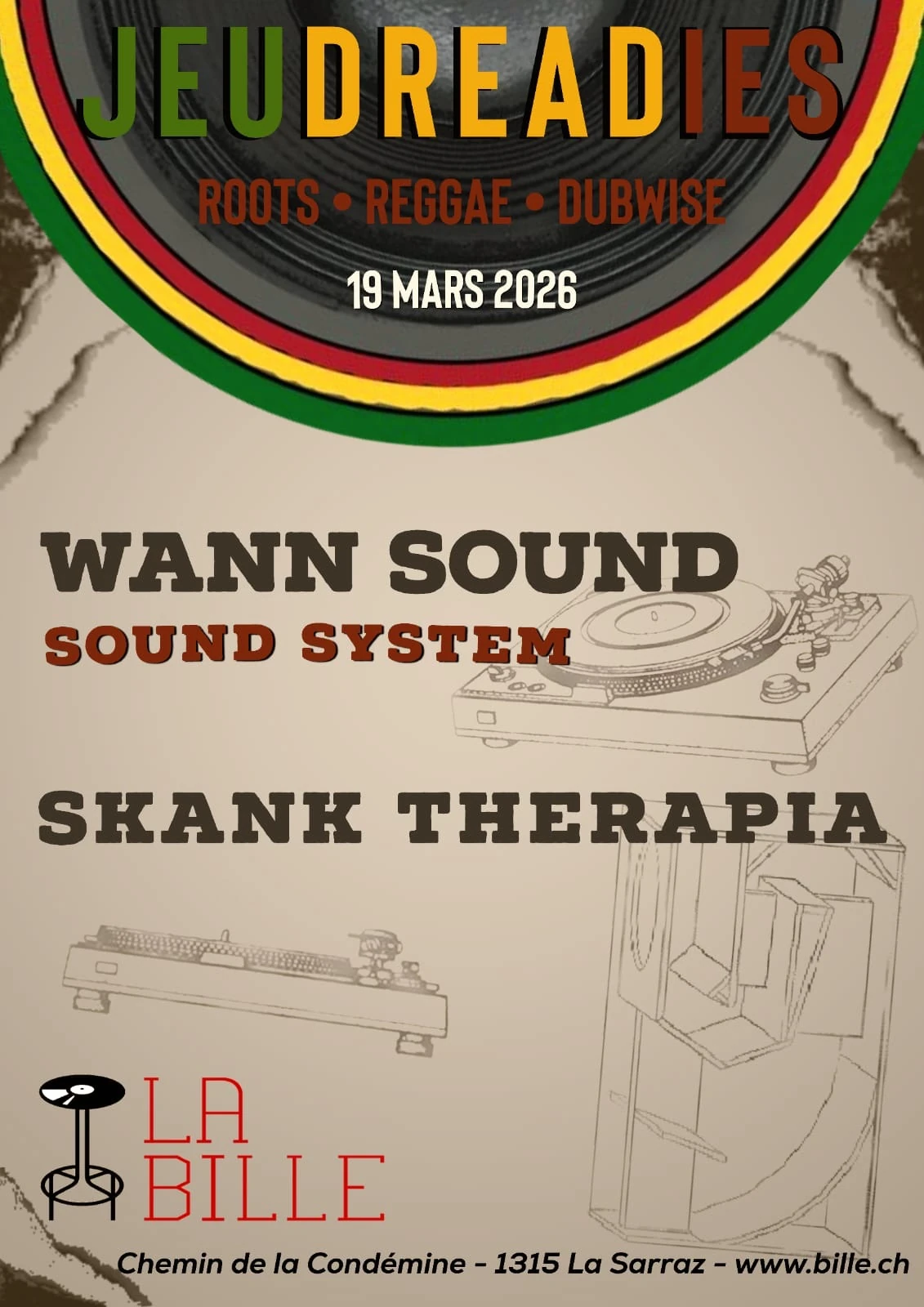 🚨 JeuDREADies a come 🚨 Comme chaque troisième jeudi du mois La Bille va vibrer au son du Roots Reggae DubWise ⚡💥 Pour ce jeudi 19 mars, on aura le plaisir de recevoir Wann Sound et Skank Therapia pour une session pleine de belles vibes ! Wann sound nous fera l’honneur d’inaugurer son sound system à cette occasion. Si tu ne veux pas louper ça, on se voit jeudi ! Comme d’hab oubliez pas vos sourires et vos good vibes, on se voit dans la danse ! 🙌🏼